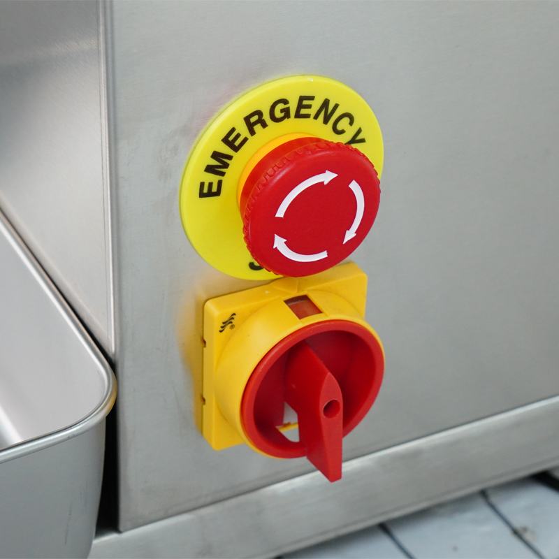 Máy thái thịt tươi sống RQ-III được trang bị cơ chế bảo vệ nhằm giảm tối đa rủi ro trong quá trình sử dụng. Một trong những điểm nổi bật là nút dừng khẩn cấp, cho phép người dùng ngắt hoạt động của máy ngay lập tức khi phát sinh tình huống bất thường.