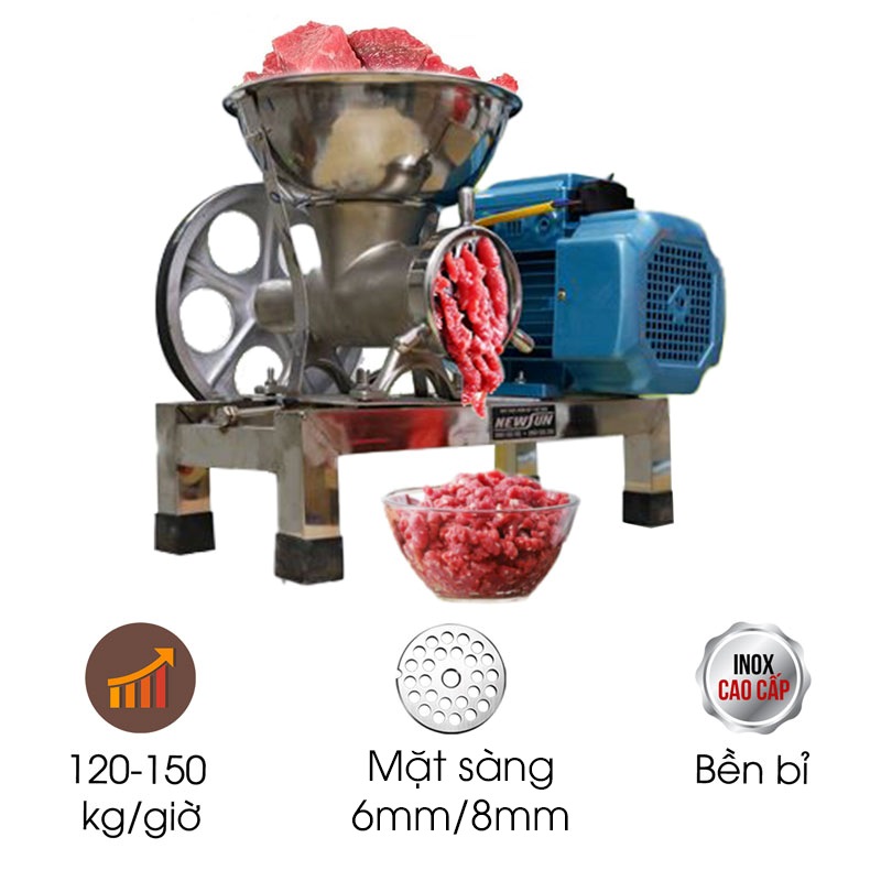 Máy xay đùn thịt công nghiệp 3kW được trang bị động cơ dây đồng công suất chuẩn 3kW, cho khả năng xay thịt nhanh và có thể xay liên tục, ổn định, không bị nóng máy hay quá tải. Năng suất đạt khoảng 120-150kg/giờ, đáp ứng tốt nhu cầu dùng trong các cơ sở kinh doanh, quán ăn, bếp ăn vừa và lớn.